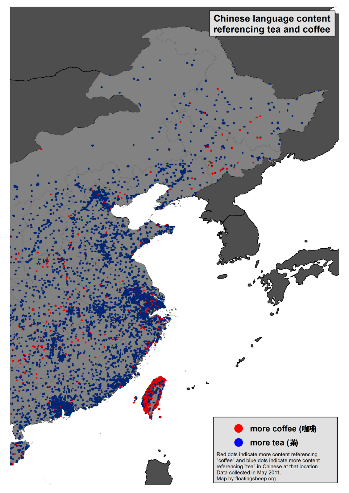 As part of our ongoing research into the online geographies of mind-altering substances, we present in this post an analysis of caffeinated beverages in China and Taiwan. In these first two maps we compare references to tea and coffee in both Chinese and English. You see that mainland China is almost entirely dominated by references to tea in both languages. Taiwan, in contrast, is mirrored by many more references to coffee in both languages. Somewhat surprising is the fact that there are some small pockets of coffee references on the mainland in English (notably Shanghai and a few in Beijing).